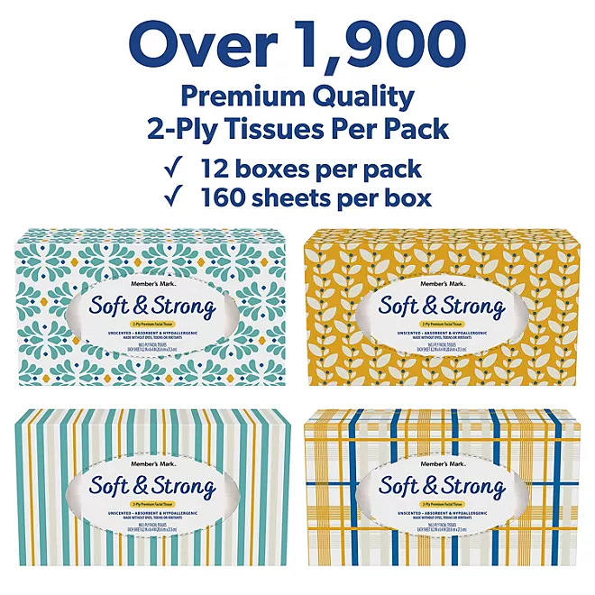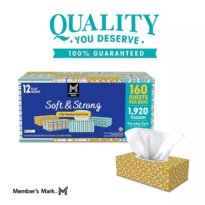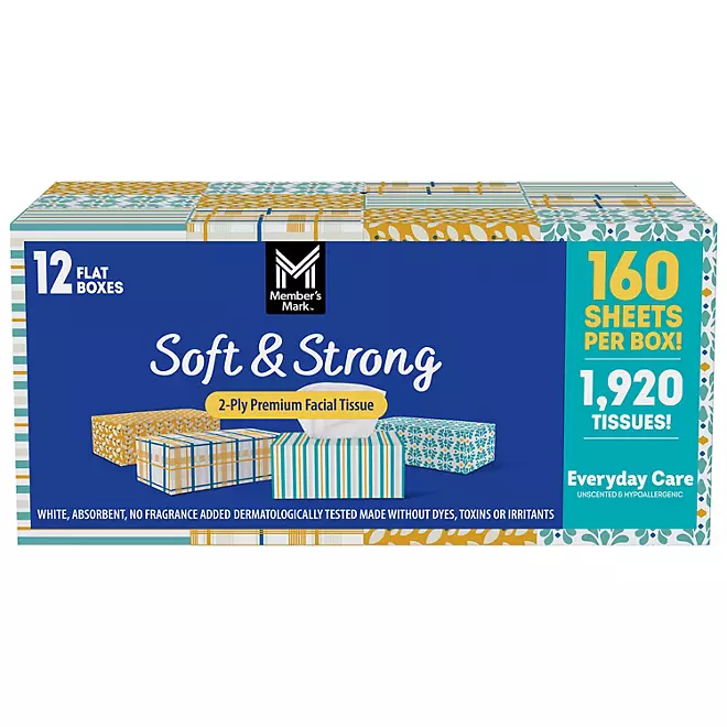 / Member’s Mark Soft & Strong 2-Ply Premium Facial Tissues 12 Flat Boxes, 160 tissues/box